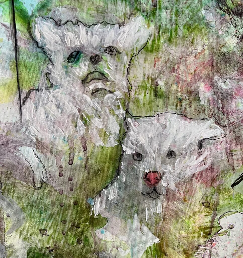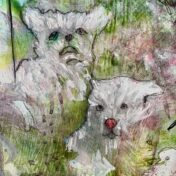 A l’aide de peinture acrylique, d’encre, de feutres et autres matériaux je recherche dés chemins possibles dans un processus parfois accidentel mais en même temps absolument évident.